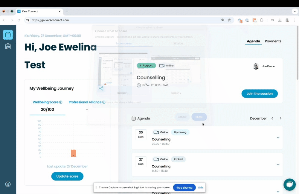 We recommend adding your credit card to your Kara Connect client account to ensure payments are processed automatically after completing your session.