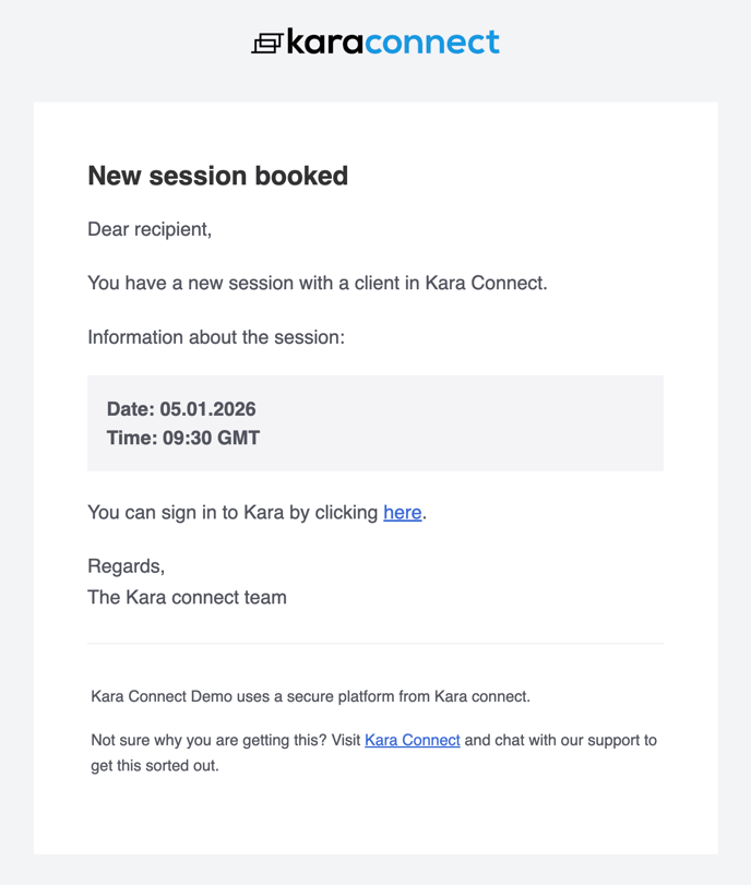 Please note that all bookings will be displayed in your Kara Connect calendar, in the Sessions tab.