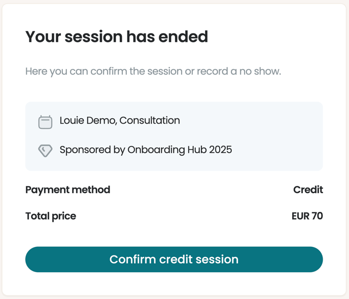 Once the session is finished, you will see the payment summary screen beside the Payment method field; this will say Credit if the session was covered by a sponsored credit.